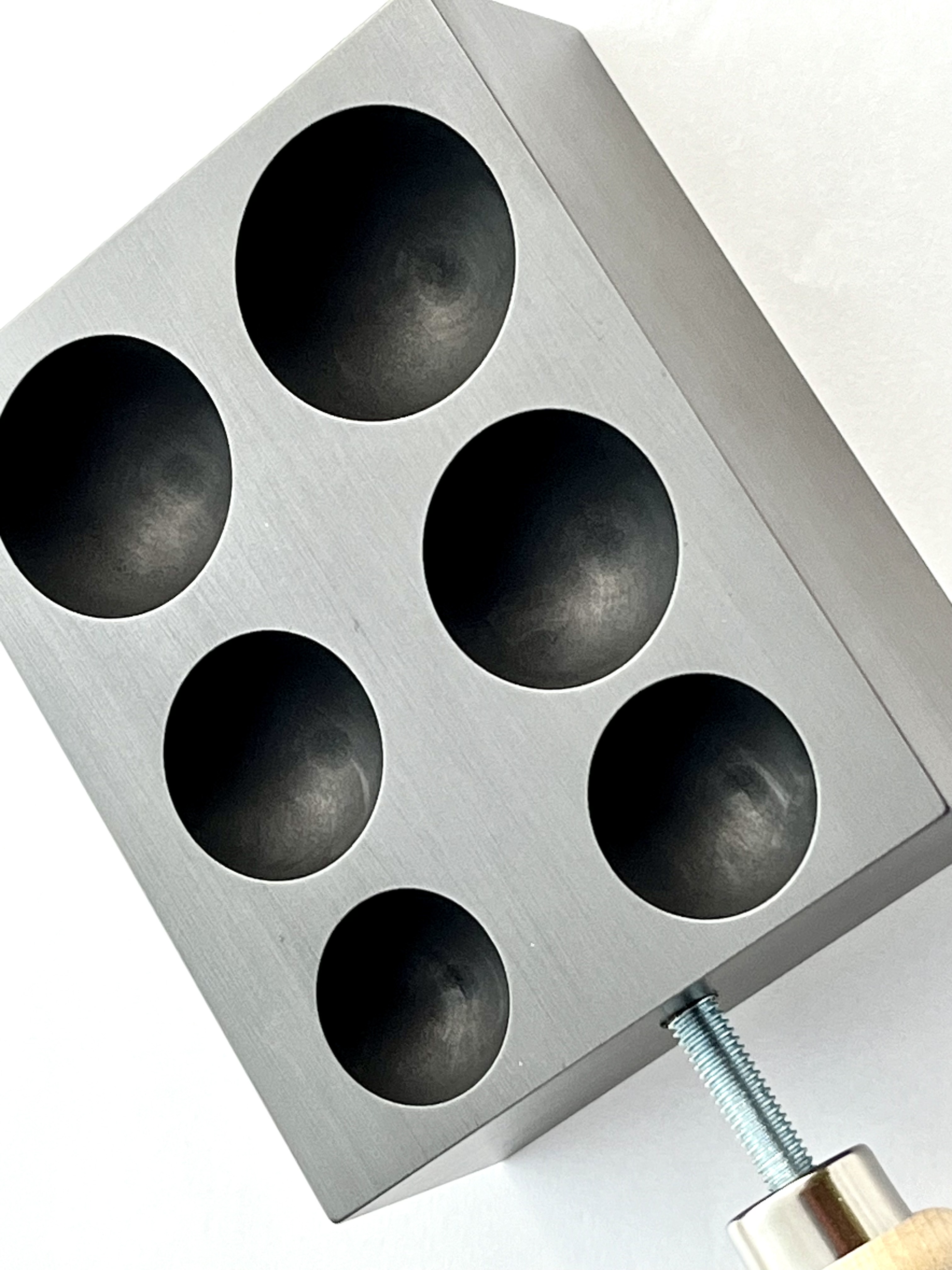 A great "Mini" Monster marble mould , 5 holes 13mm , 16mm , 19mm , 26mm & 32mm . The Mould itself measures 75mm dia x 25mm thick and including the handle is 260mm long.